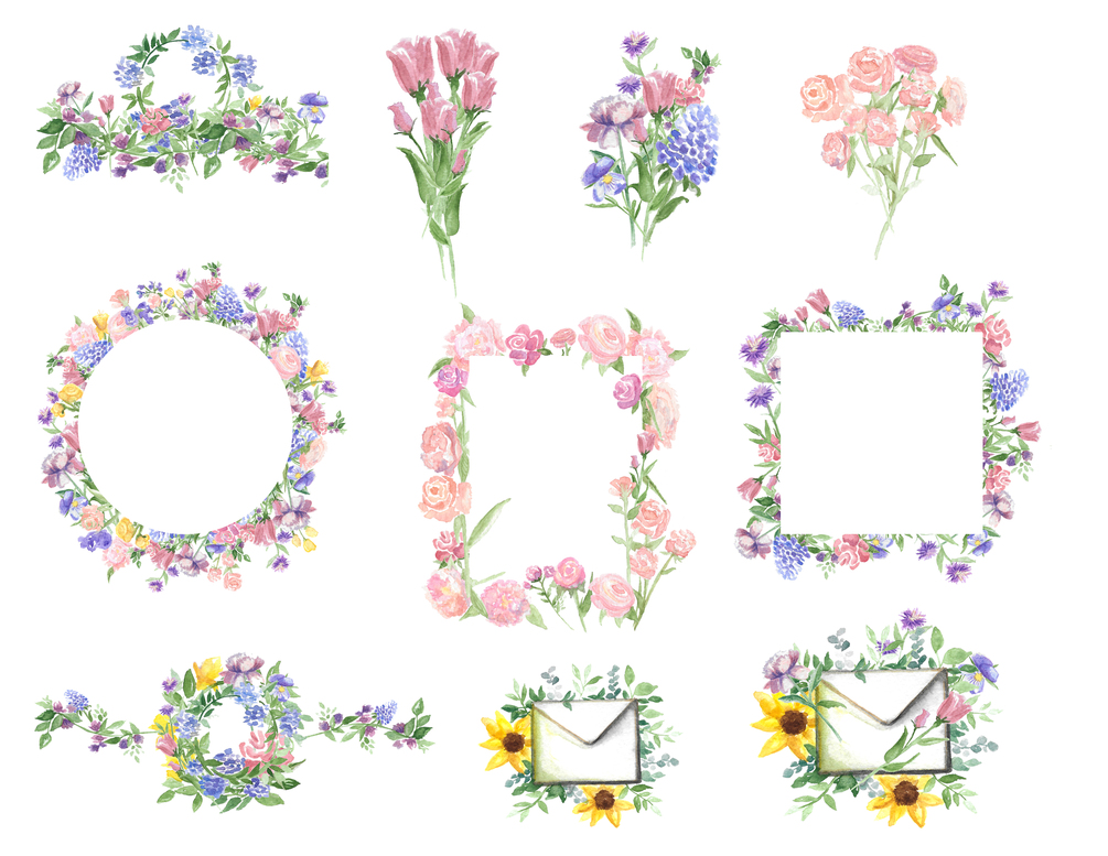 Use the individual flowers to create your own unique designs on stationery, greeting cards, stickers, digital projects and more. You can change the size, duplicate, and rotate the flowers to make different combinations or bouquets. Premade bouquets and card designs are included in the package, which will look great for place cards, invitations, thank you notes, and so forth. Add your own fonts or handwriting to the printed designs.